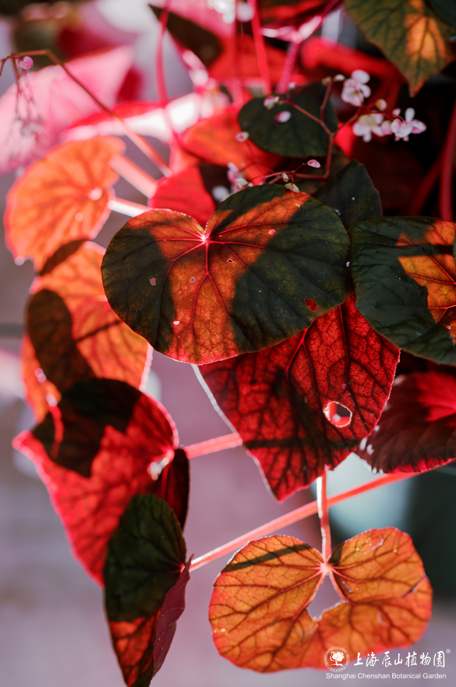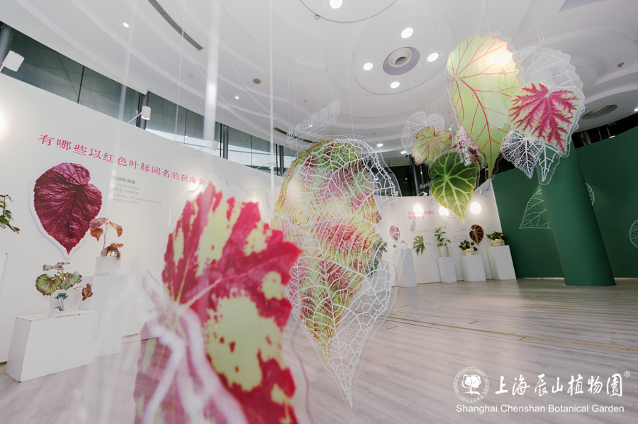 本次展览展示了来自中国、亚洲、美洲及非洲的百余种特色秋海棠。其中,红纹秋海棠娇艳欲滴,黑峰秋海棠神秘深邃,巴西变色秋海棠随光影流转变幻色彩,乌头叶秋海棠以奇特叶形抓人眼球,各类品种联袂演绎叶片的“结构之美”与“生命之智”。