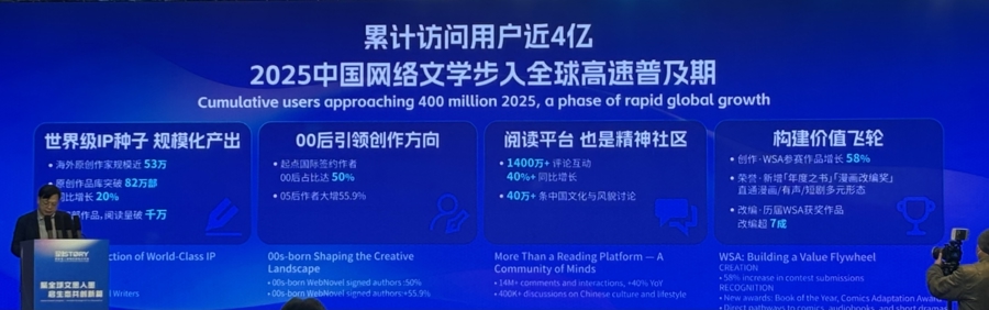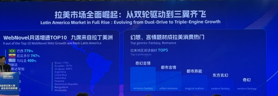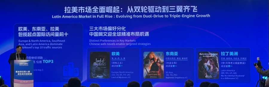 《2025中国网络文学出海趋势报告》在开幕式上发布,报告以阅文集团和行业调查材料为主要分析蓝本,其核心信息为:在2025年,网络文学迎来全球高速普及阶段,拉美的强势崛起,让网络文学市场形成了北美、欧亚、拉美三翼齐飞的格局,模式方面,IP引领文旅价值升维,成为了全球范围内的产业现象。