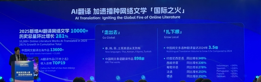 技术驱动下的语言桥梁,也让中国网文更好地走进世界。今年,中国网文翻译出海作品总量已超13600部,多个语种的翻译量达到了2024年的3.5倍,具体表现为:印度尼西亚语同比增长349%、西班牙语同比增长336%、葡萄牙语同比增长278%等。泰语、韩语、菲律宾语、土耳其语等语言更是从无到有,泰语翻译作品达898部。