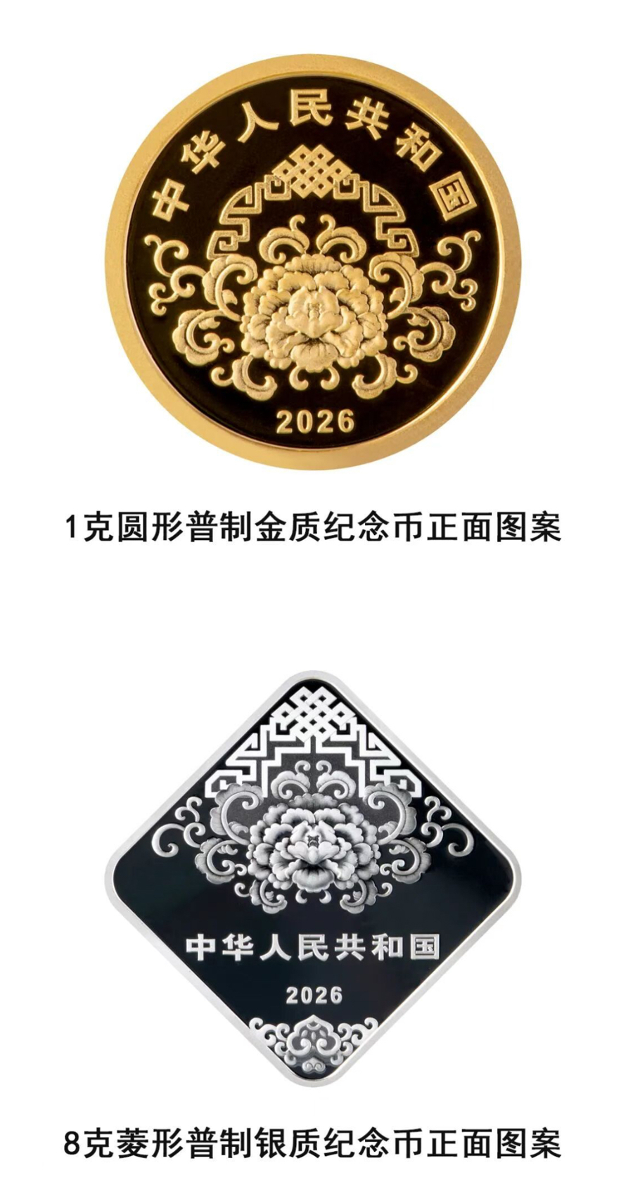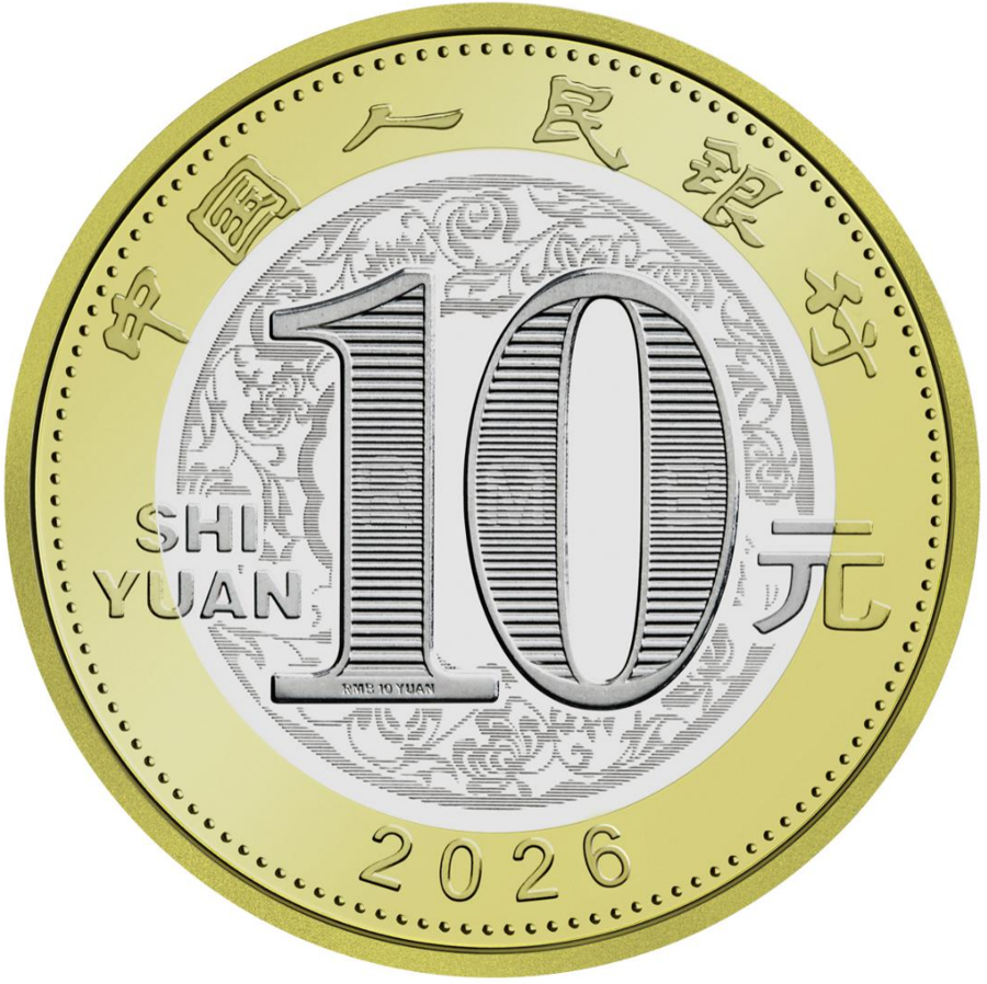 其中,双色铜合金纪念币正面图案为“中国人民银行”、“10元”字样,汉语拼音字母“SHIYUAN”及年号“2026”,底纹衬以团花图案。