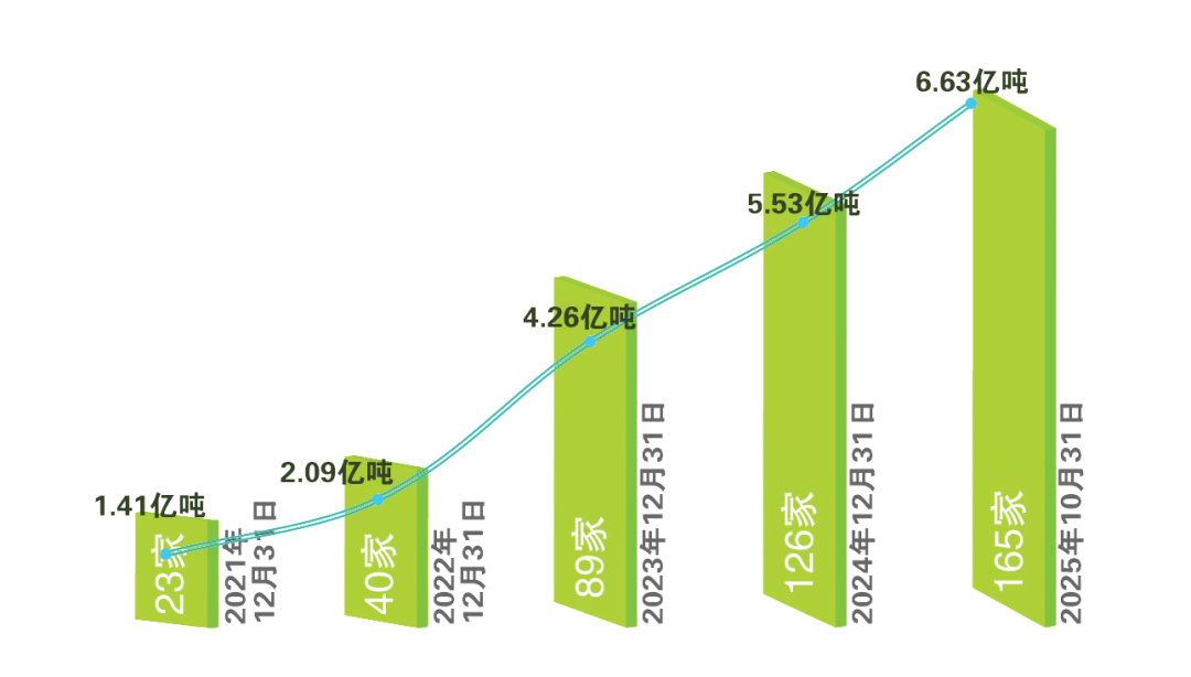 “十四五”期间,中国钢铁行业超低排放改造呈现出明显的加速态势。从2021年底仅23家企业、1.41亿吨产能完成全过程超低排放改造,到2025年10月31日已达165家企业、6.63亿吨产能,分别增长了7.2倍、4.7倍。这一进程在2023年后显著提速,仅2023年就新增49家企业完成改造,反映出钢铁行业在环境治理上的持续投入与显著成效。