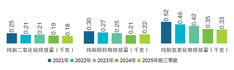 “十四五”期间,钢铁行业重点统计企业吨钢二氧化硫、颗粒物、氮氧化物排放量均呈现明显下降趋势。截至2025年第3季度末,上述3项指标分别降至0.18千克、0.22千克、0.33千克,较2021年底的数据分别下降28%、26.7%、36.5%。