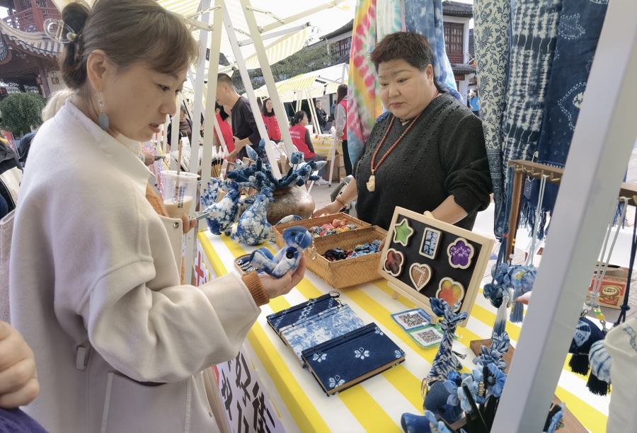 在七宝古镇钟楼广场,集市依托七宝老街的文旅热度,融入非遗扎染、中草药文化展示等特色摊位,与老街的传统氛围相映成趣,吸引了不少游客和本地居民共同参与。